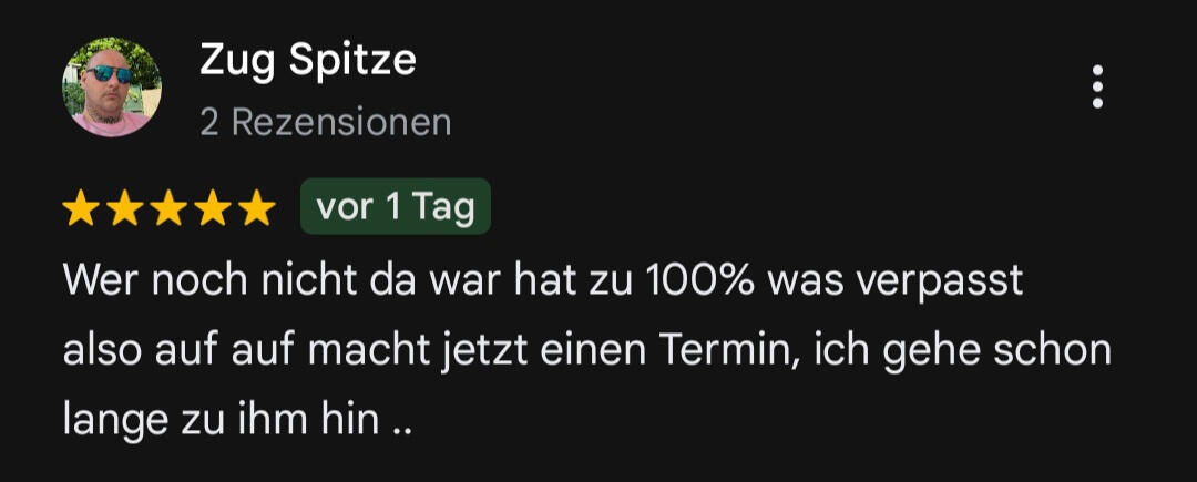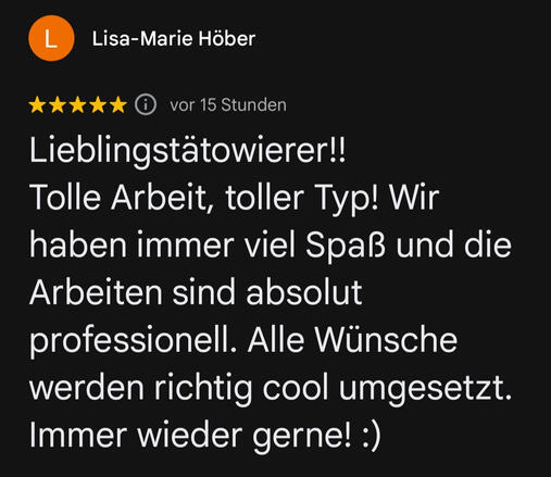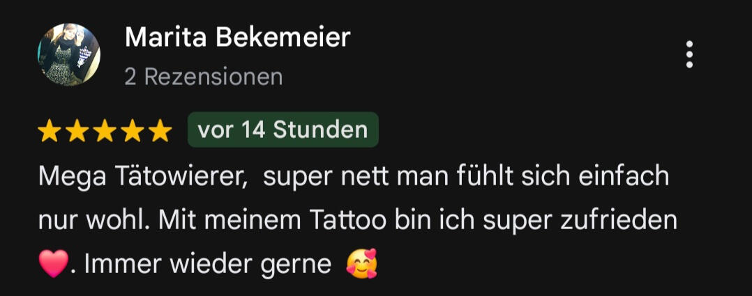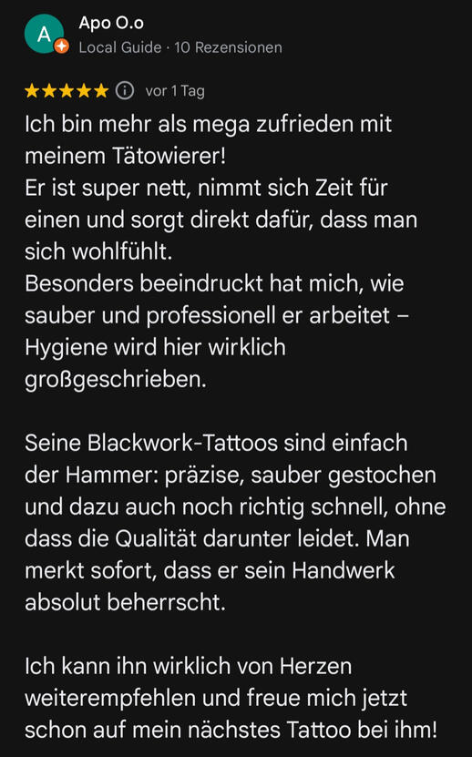 FAQ – Häufige FragenWie kann ich einen Termin bei dir buchen?Am besten schreibst du mir direkt über WhatsApp oder per Instagram. Erzähl mir kurz, was du dir vorstellst – Motiv, Stelle, Stil – dann klären wir den Rest persönlich.Was kostet ein Tattoo bei dir?Das hängt vom Aufwand ab. Kleine Letterings starten ab ca. 80 €, größere Projekte nach Aufwand. Nach der Motivbesprechung bekommst du eine faire Preisspanne.Machst du auch individuelle Designs?Ja – jedes Tattoo ist bei mir ein Unikat. Ich arbeite keine Vorlagen von Pinterest ab. Du bekommst ein Motiv, das zu dir passt und das ich speziell für dich zeichne.Wie lange dauert ein Termin?Kommt aufs Motiv an. Kleine Schriftzüge oder einfache Blackwork-Designs brauchen meist 1–2 Stunden, große Pieces können mehrere Sitzungen dauern. Ich sag dir vorher, womit du rechnen kannst.Wie bereite ich mich auf meinen Termin vor?Komm ausgeschlafen, iss vorher was und trink genug Wasser. Kein Alkohol oder Drogen am Vortag. Trag lockere Kleidung, die die zu tätowierende Stelle freigibt.Was muss ich nach dem Tätowieren beachten?Ich geb dir Aftercare-Anweisungen mit – wichtig ist: sauber halten, nicht kratzen, Sonne vermeiden. Gute Pflege = gutes Endergebnis.Stichst du auch Hände, Hals oder Gesicht?Nur bei erfahrenen Tätowierten. Ich will sicherstellen, dass du weißt, worauf du dich einlässt – solche Stellen sind nicht für jede/n.Machst du Cover-ups?Kommt drauf an, was drunter ist. Schick mir ein Bild vom alten Tattoo, dann schau ich, ob und wie man’s gut abdecken kann.